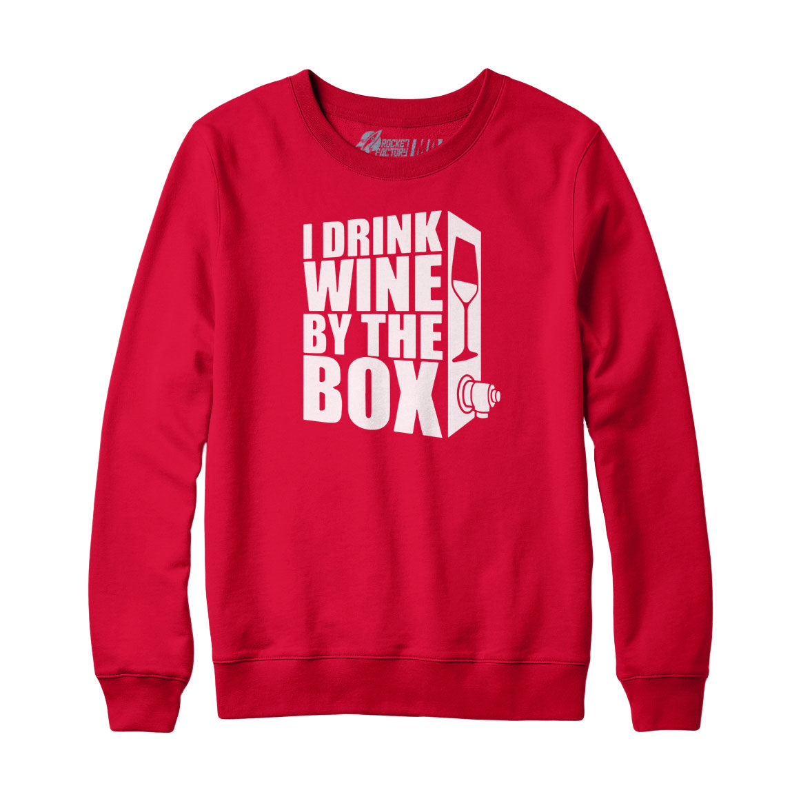 A lighthearted and humorous graphic sweatshirt proudly stating "I Drink Wine by the Box," featuring a playful design that celebrates the joy of enjoying wine in a relaxed and unapologetic manner, perfect for wine enthusiasts with a sense of humor.