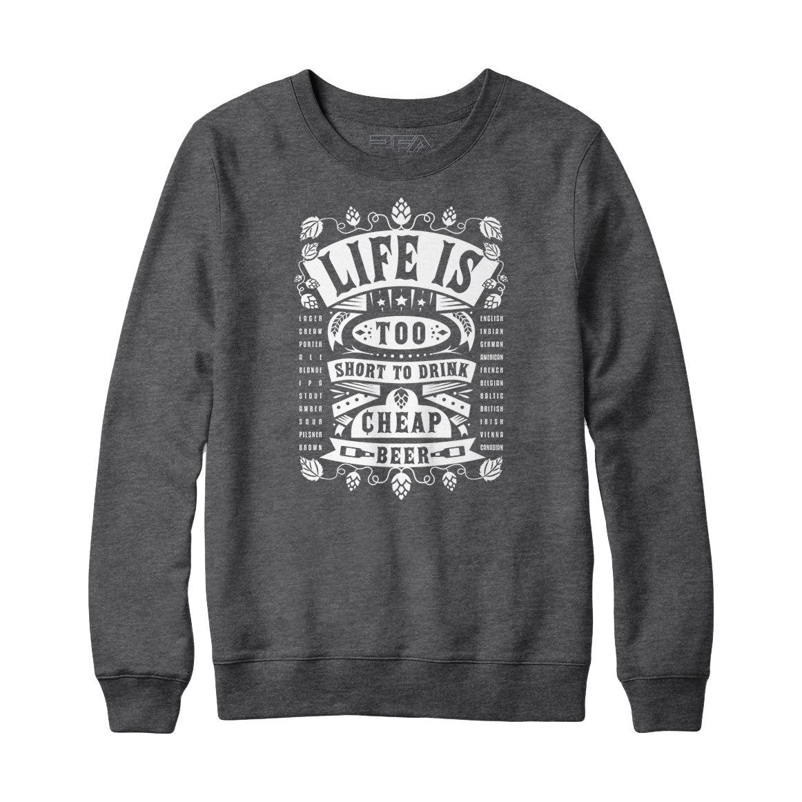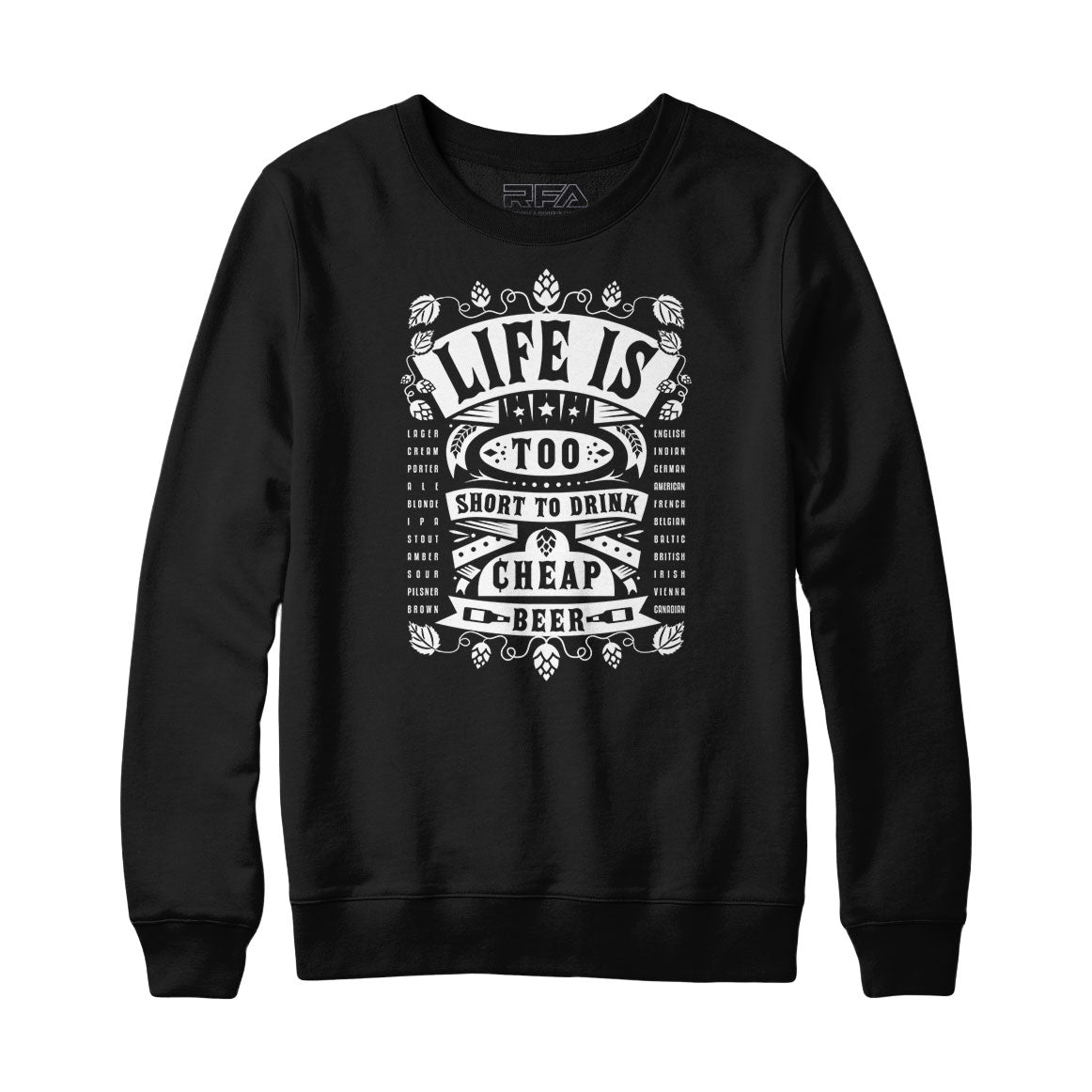 Life really is too short to drink cheap beer. This awesome sweatshirt design celebrates craft beer. Whether IPA India Pale Ale, Gose, Stout, Blonde, Lager, Ale, Porter, British, Irish, Red, Brown, Double Bock, Steam Beer, Amber, American, Wheat, Belgian, Lambic, Doppelbock or Dunkel beers (to name a few) good beers make life worth living. So don't cheap out- drink craft beer.