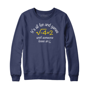 Get ready to embrace the hilariously nerdy side of life with our "It's All fun and Games until someone looses and i" cotton/poly blend sweatshirt and hoodie. This witty and mathematically inclined garment features a bold math formula that yields an irrational number. Perfect for math enthusiasts and lovers of quirky humor, this sweatshirt or hoodie will have you chuckling while flaunting your unique style. Crafted with a comfortable cotton/poly blend, it offers warmth and softness for your utmost comfort. So, whether you're solving equations or simply cracking jokes, our "It's All fun and Games until someone looses and i" apparel will keep you entertained and stylishly geeky.