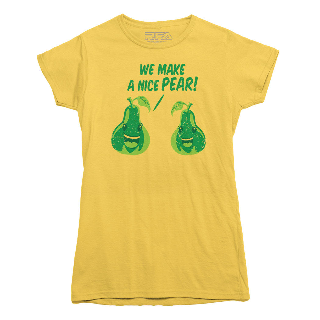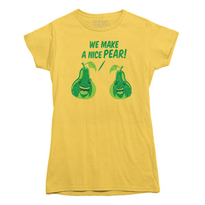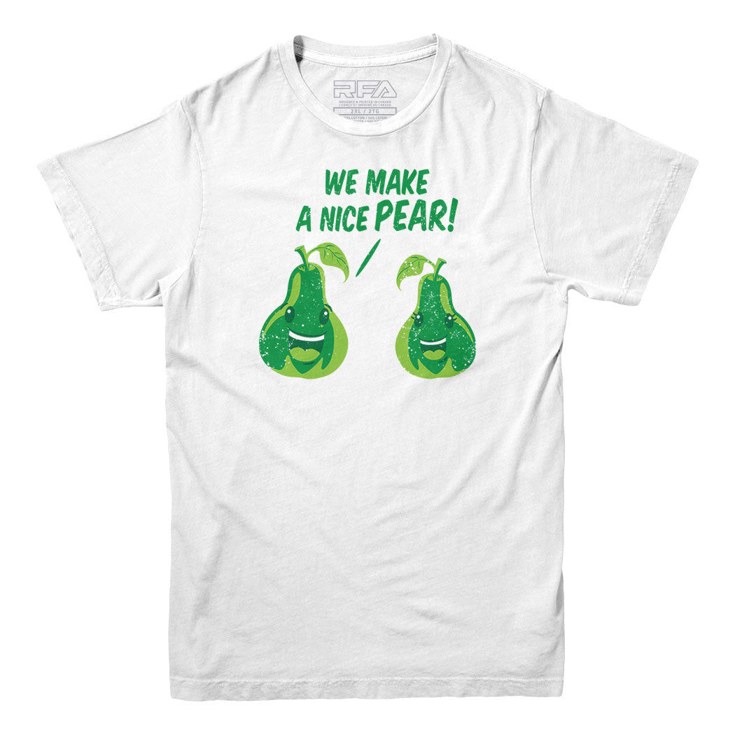 Embrace the world of puns and fruity humor with this delightful t-shirt that exclaims "We Make a Nice Pear!" accompanied by a playful illustration of two pears, perfect for those who appreciate clever wordplay and want to share a smile with others while showcasing their love for fruit and a good laugh.Â