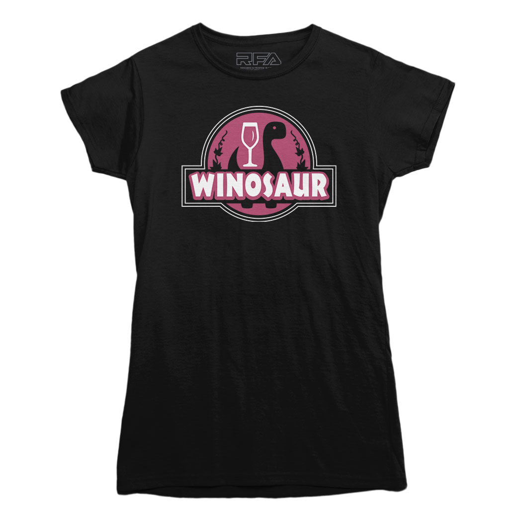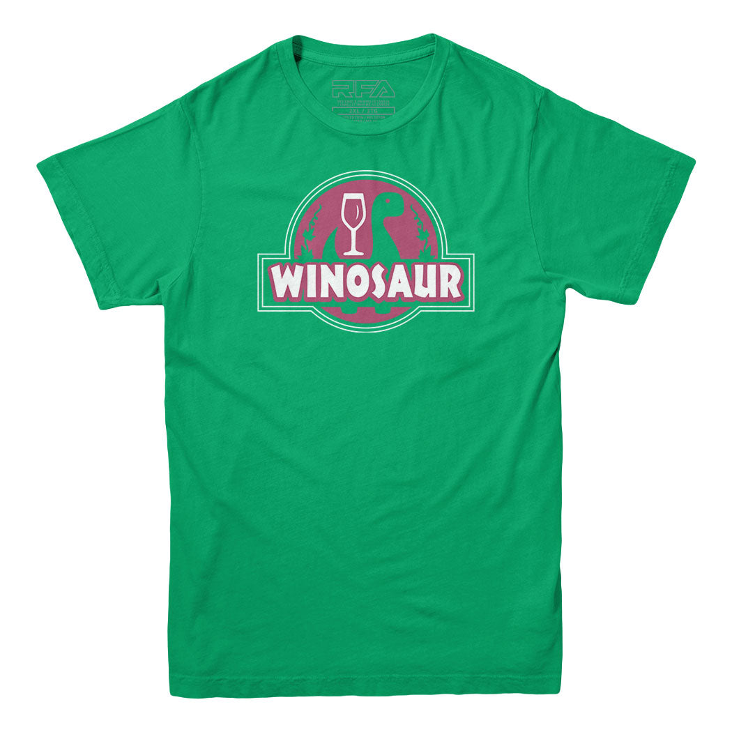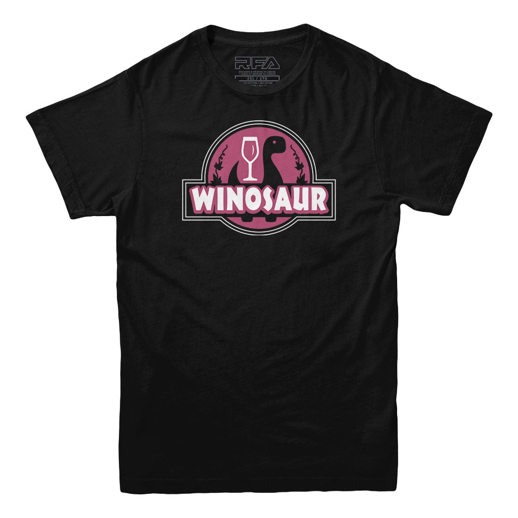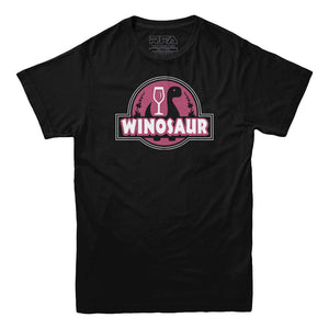 Unleash your inner "Winosaur" with this Jurassic Park parody logo t-shirt designed for wine lovers, blending the love for wine with the prehistoric charm of dinosaurs in a playful and stylish way.