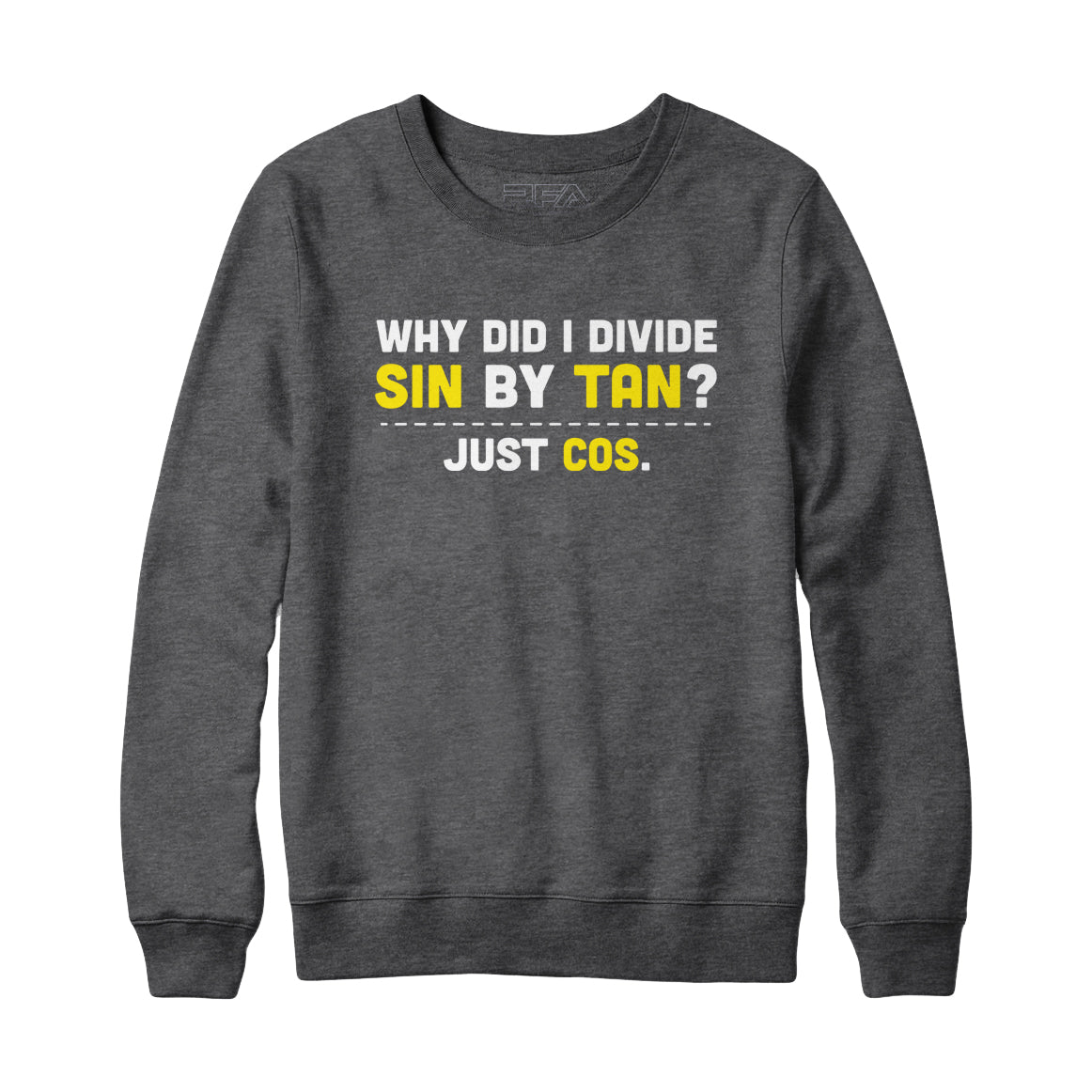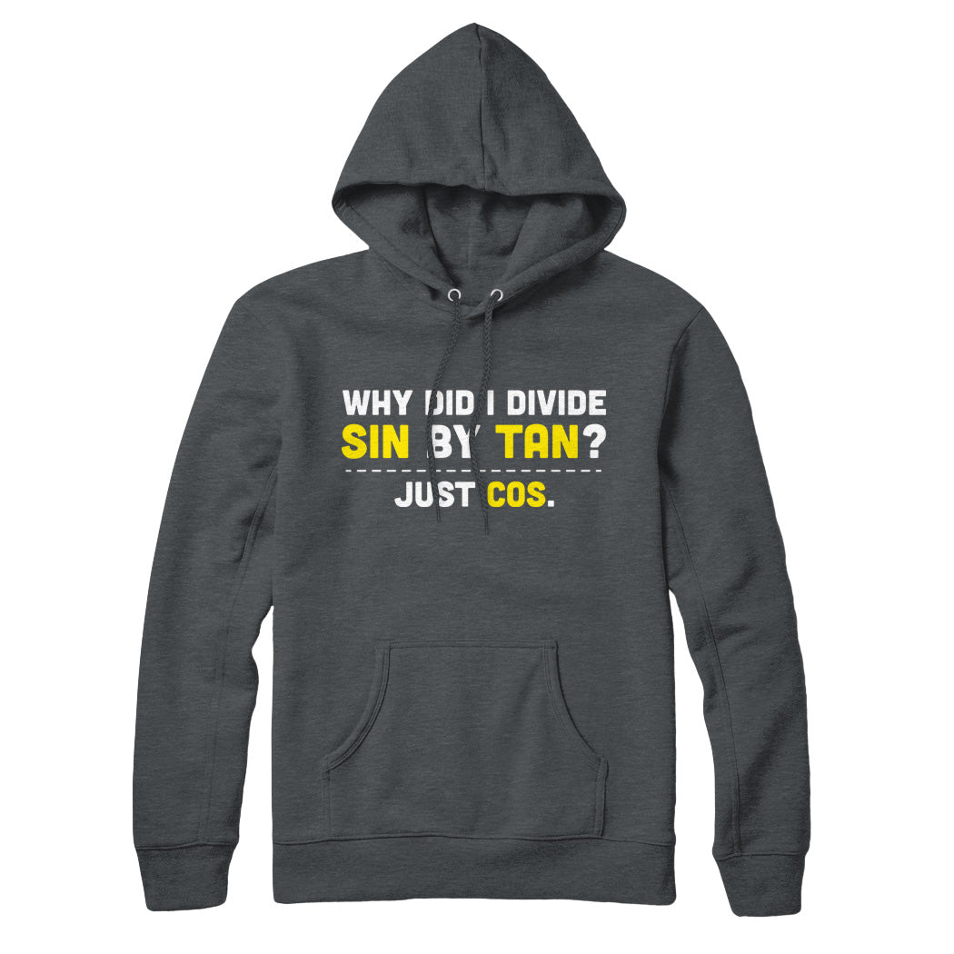Introducing our hilariously witty "Why did I divide Sin by Tan, just Cos" cotton/poly blend sweatshirt and hoodie! If you're a math enthusiast with a penchant for clever wordplay, this garment is a must-have addition to your wardrobe. The pun-tastic slogan humorously plays with mathematical functions, showcasing your wit and love for numbers. Crafted with a cozy cotton/poly blend, this sweatshirt or hoodie offers both comfort and style. Whether you're a math whiz or simply appreciate a good laugh, our "Why did I divide Sin by Tan, just Cos" apparel will keep you warm, entertained, and proudly displaying your mathematical humor. Get ready to wear your mathematical pun with pride and bring smiles to fellow math aficionados everywhere!