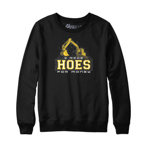 If you are a heavy equipment operator, and you like to make people laugh, you need this I ride Hoes for money sweatshirt in your closet. It's grammatically correct, though cheekily inappropriate. Wear it to the bank when depositing your construction paycheck, and see the reaction on peoples face.