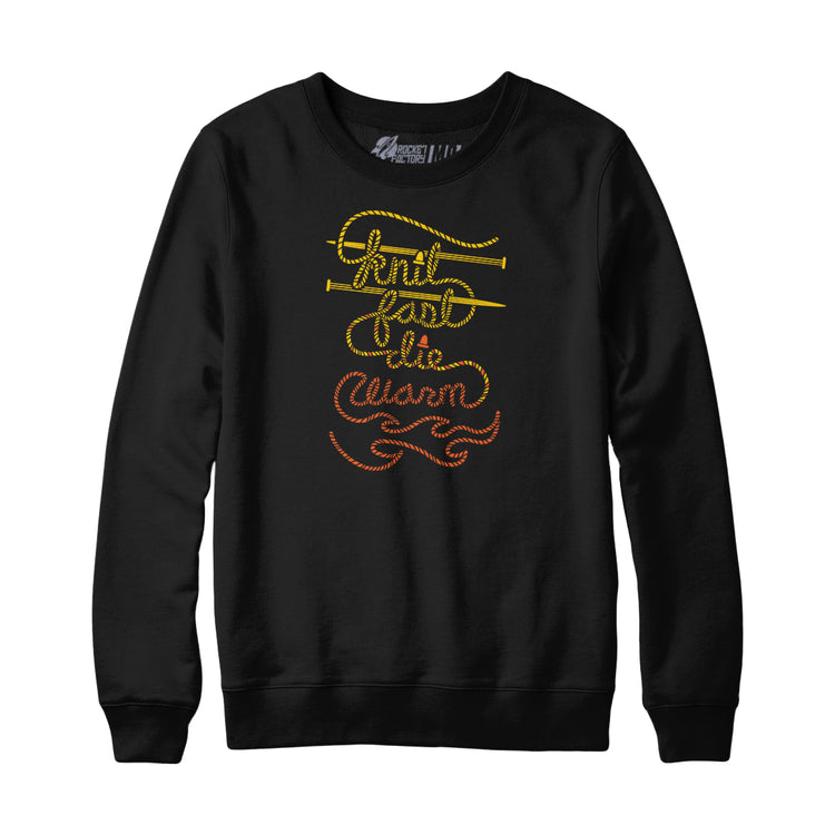 This sweatshirt is the perfect mantra for the hard core knitters out there- and the hobbyist knitters too. Knit fast, die warm. Â