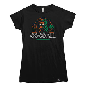 The Neon Goodall T-shirt reflects patience and discovery with a neon-inspired portrait and icons representing her work in primatology and conservation. It’s a calm glow for curious observation.