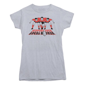 Score big on laughs with this uproarious rugby-themed t-shirt that boldly declares "Support Your Local Hooker" showcasing your love for the rough and tumble sport while adding a touch of humorous charm, making it the perfect shirt for rugby enthusiasts who appreciate a good scrum and a well-earned pint afterwards. Get ready to tackle the day with a smile and a cheeky sense of humor!