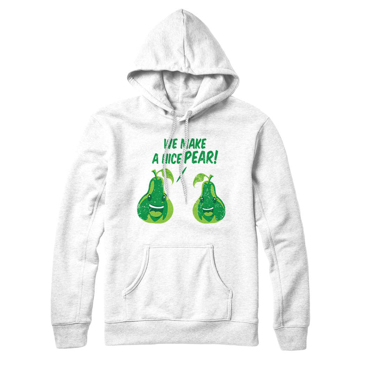 Embrace the world of puns and fruity humor with this delightful sweatshirt that exclaims "We Make a Nice Pair!" accompanied by a playful illustration of two pears, perfect for those who appreciate clever wordplay and want to share a smile with others while showcasing their love for fruit and a good laugh.Â